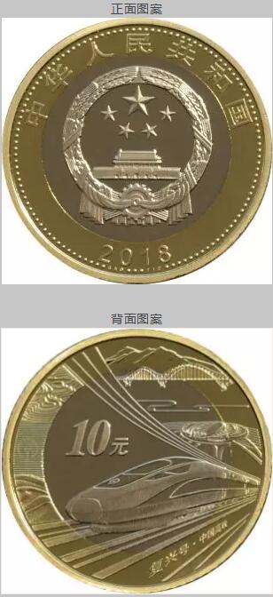 中國高鐵普通紀念幣正面圖案為國徽,其上方刊“中華人民共和國”國名,下方刊年號“2018”字樣;背面圖案主景為“復興號”動車組,背景為大勝關長江大橋、北京南站、“復興號•中國高鐵”文字及高山、梯田、沙漠等。